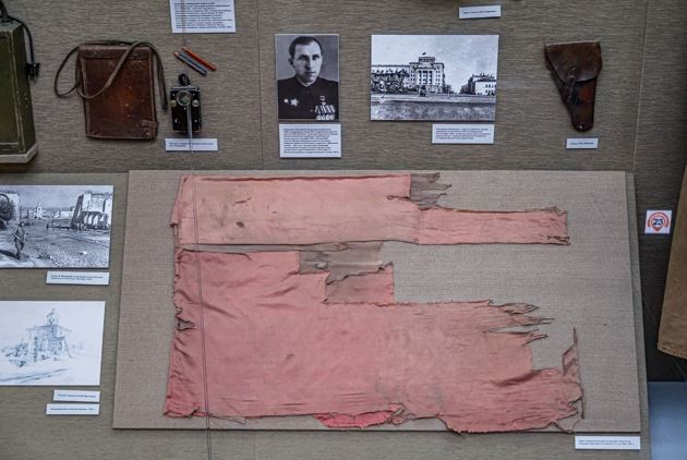 Именно этот флаг над гостиницей «Смоленск» водрузили 25 сентября 1943 года красноармейцы из батальона капитана Прокофия Фёдоровича Клепача, входившего в состав 1106-го стрелкового полка 331-й стрелковой дивизии.